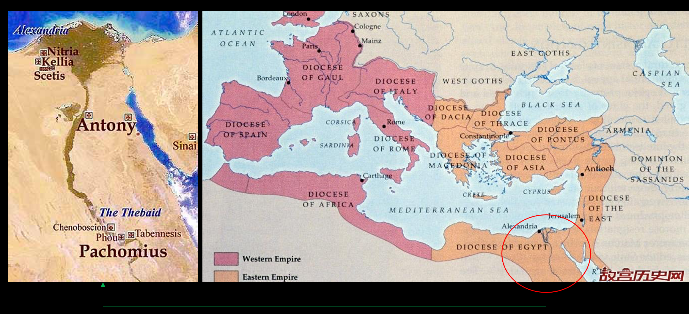 安东尼出生于251年,大约在356年安息主怀。他并非修道传统的第一人,但确实是修道传统的早期典范。他修道的地点如下图