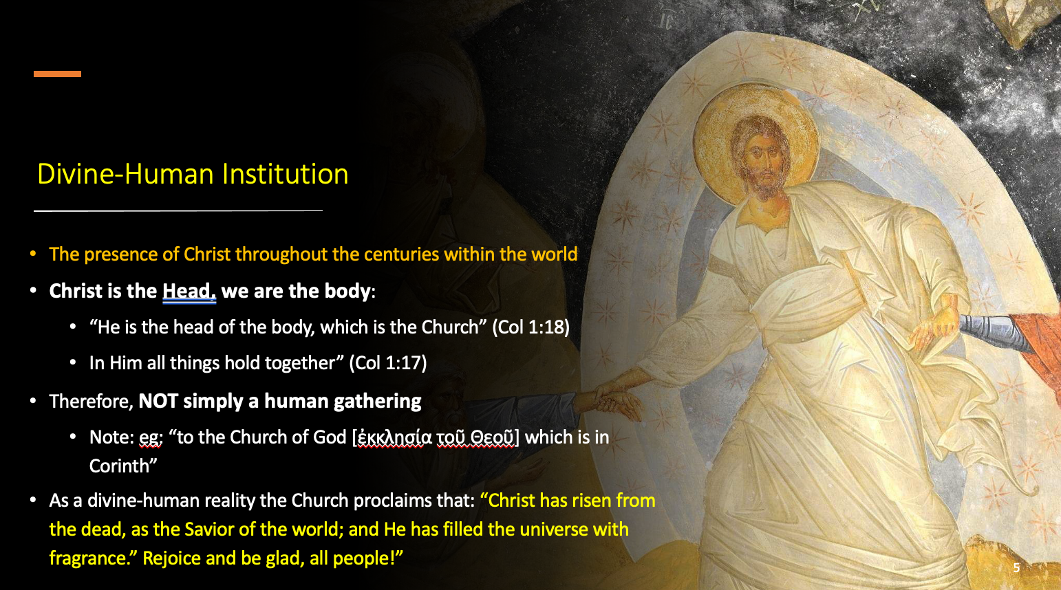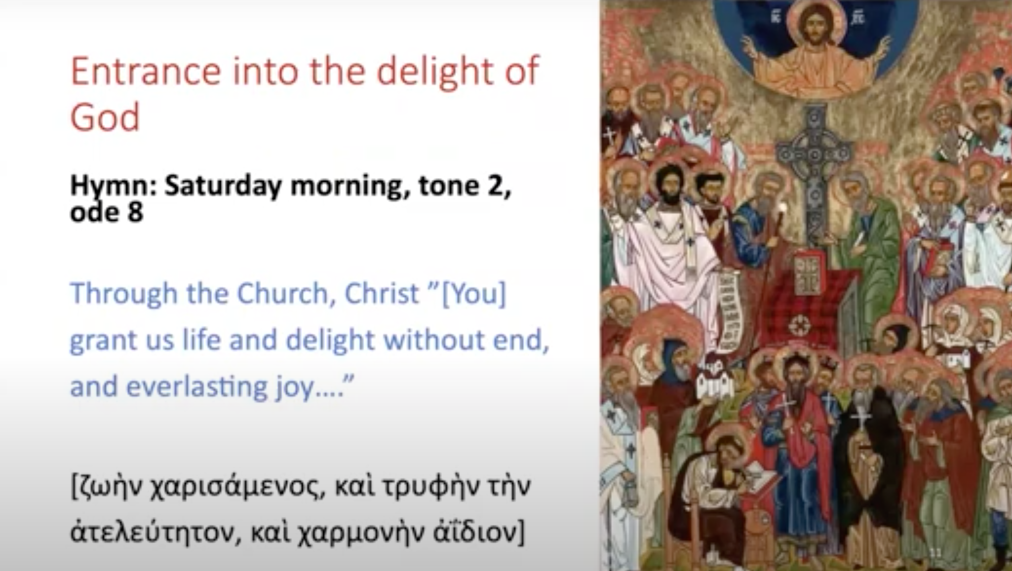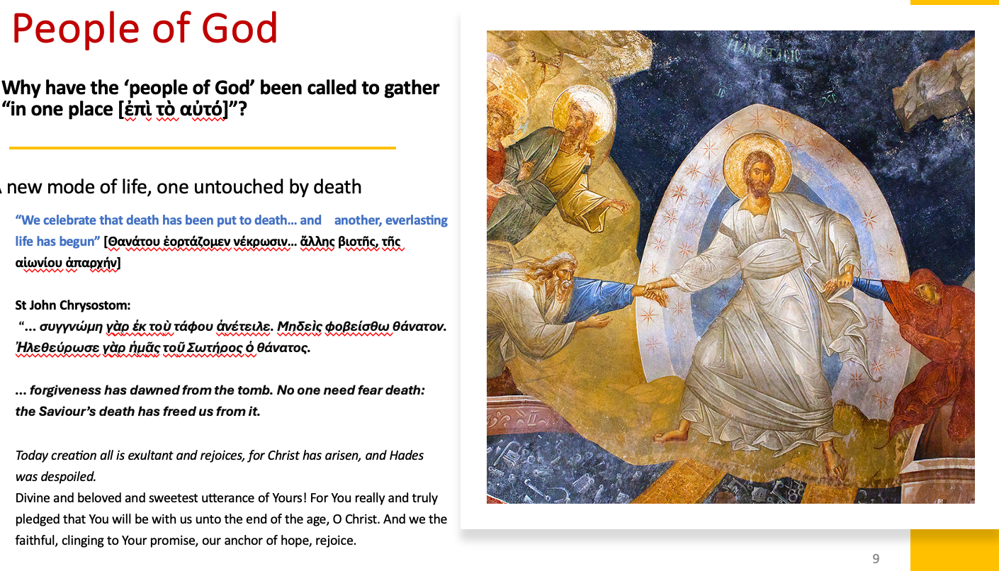这里发生了什么?从幻灯片中我们可以看到 最后一点是,作为神圣的人类实在。教会就向这首赞美诗——东正教会在主日唱的——所宣告的: 基督从死里复活,作为世界的救世主,他让万有充满 馨香,让众人欢喜快乐。