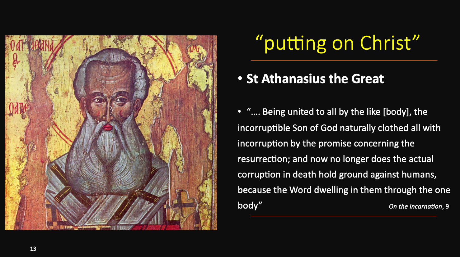 所以在写下《圣经》之后,许多教父反思教会是基督的身体。「他们认为」教会是我们穿戴基督的地方。在那里,我们以基督为衣。根据圣阿塔纳修说的,复活而丰盛的生命关闭了朽坏之门。在死亡中真正的朽坏不再反对人类,因为道住在我们的教会内。通过这个身体,死亡不再 控制我们!