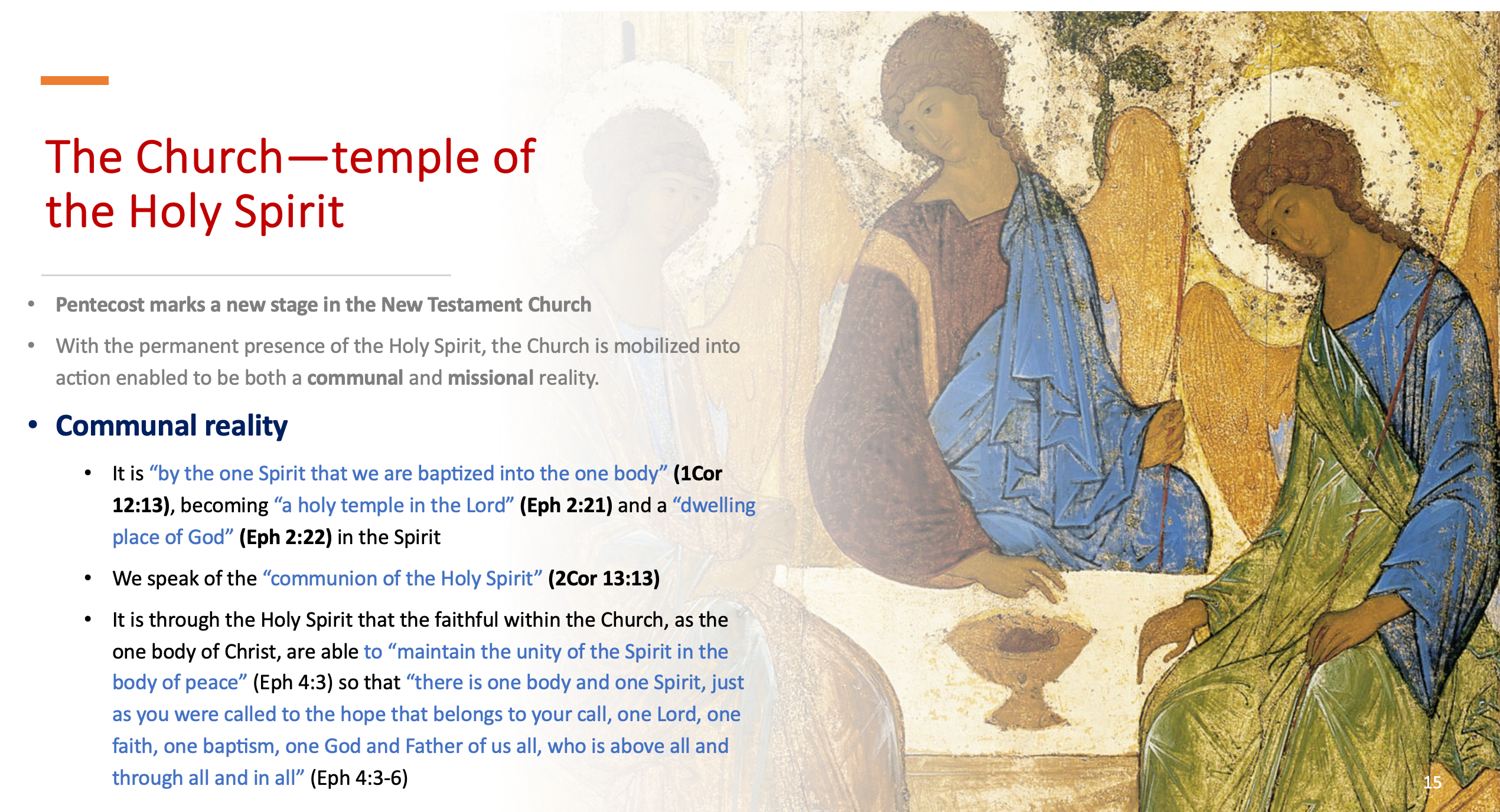 因此,从我选择的这 3 幅图片中。你可以开始体会到 教会有三位一体的一面。事实上 在正教教会学中教会常常被描述为三位一体的奥秘的反映。