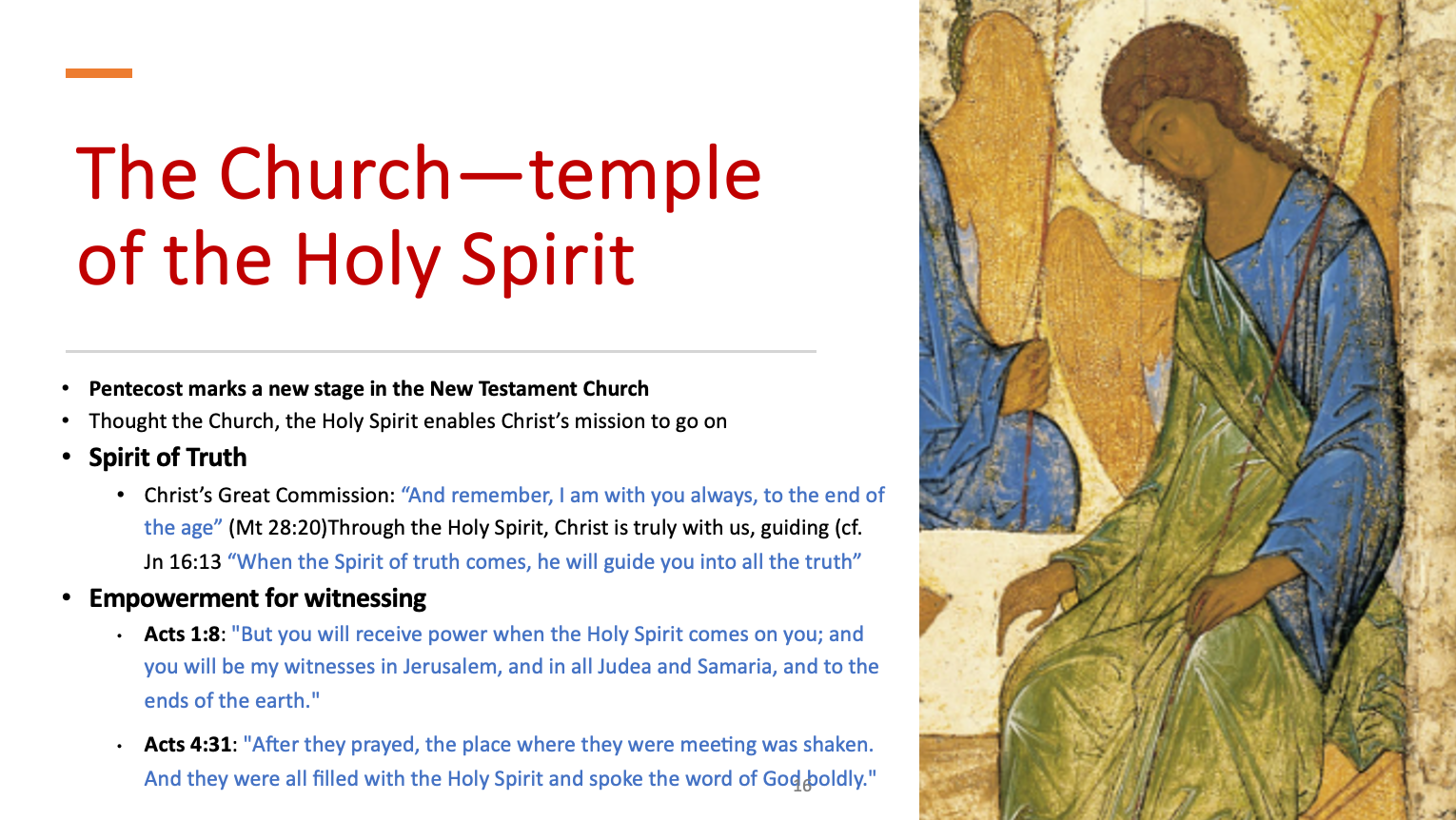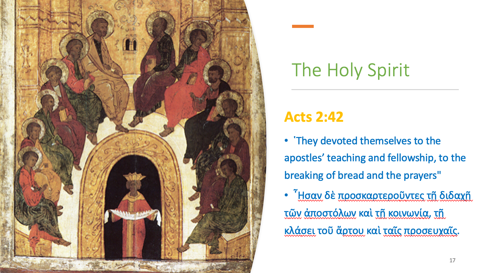 现在,如果教会就是我们与基督紧密结合的实在。这是如何实现的?答案是就是基督的 圣灵,他所应许的圣灵。在五旬节那天,他将引导我们进入真理的丰盛之中,使基督与祂的子民之间的相交成为现实。所以,当我们说教会与基督的相交是通过圣灵的永久同在。这是在教会的信徒中,从五旬节那天开始的。自五旬节那天开始,教会就进入了一个新的阶段。从这一天起,上帝满溢的圣灵的恩赐在教会内,圣灵也在教会内。有了圣灵,在教会内,基督与信徒的合一成为现实。