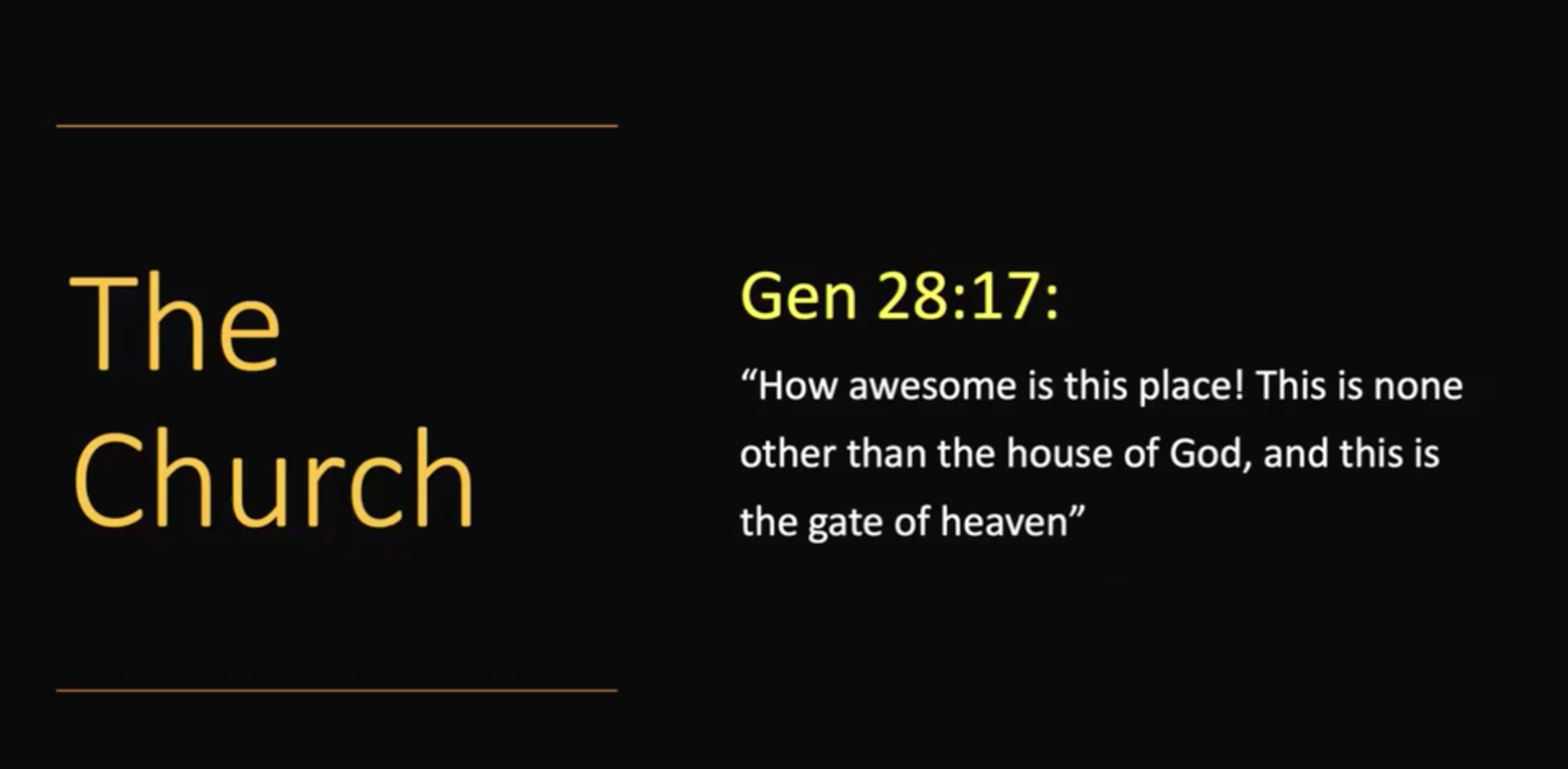 我们以创世纪这节经文结束:这地方何等可畏!这不是别的,乃是 神的殿,也是天的门。下次,我们将探讨教会与圣餐礼的关系。