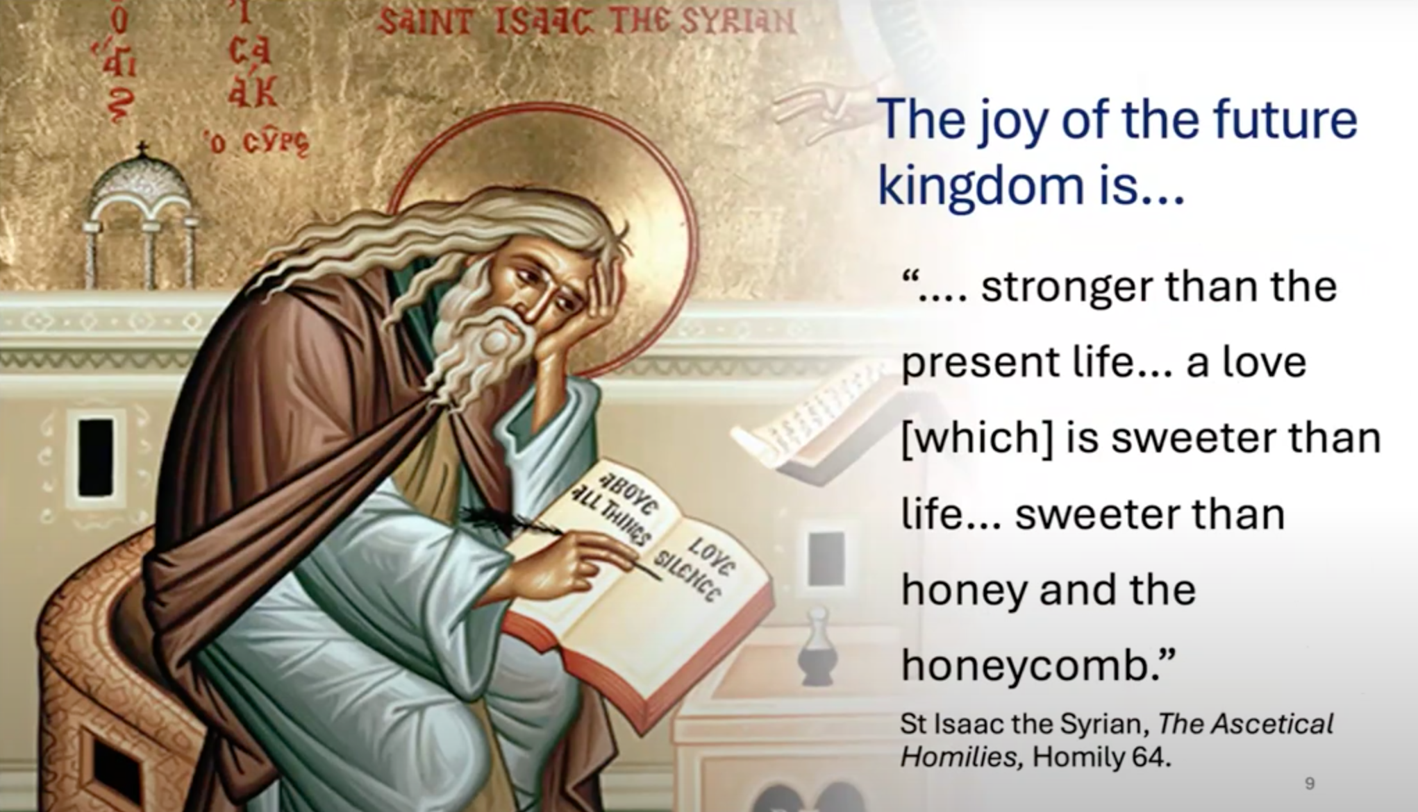So our future is God's heavenly kingdom And again to quote from Saint Isaac the Syrian The joy of the future kingdom is stronger than this present life…a love which is sweeter than life …honey and the honeycomb It's a life which is permanent and not fleeting
