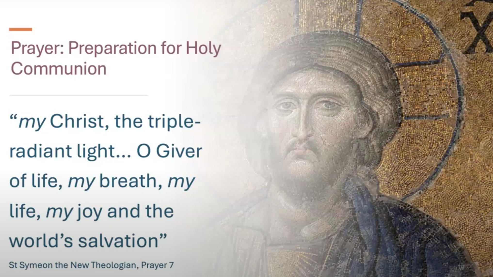So we are called to really focus our attention On the only one thing needful. And in a prayer that Orthodox Christians Read in preparation for Holy Communion. They pray in a very personal and intimate manner. Reading the words of Saint Simeon the New Theologian Orthodox Christians pray 7. “My Christ The triple radiant light, O giver of life My breath My life, My joy and the world's salvation. Notice the intimacy with which Saint Simeon Refers to Jesus Christ his Savior.