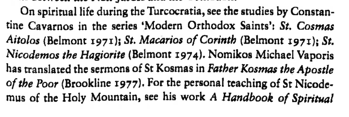 On spiritual life during the Turcocratia, see the studies by Constantine Cavarnos in the series ‘Modern Orthodox Saints’: St. Cosmos Aitolos (Belmont 1971)5 St. Macarios o f Corinth (Belmont 1971); St. Nicodemos the Hagiorite (Belmont 1974). Nomikos Michael Vaporis has translated the sermons of St Kosmas in Father Kosmas the Apostle o f the Poor (Brookline 1977). For the personal teaching of St Nicodemus of the Holy Mountain, see his work A Handbook o f Spiritual