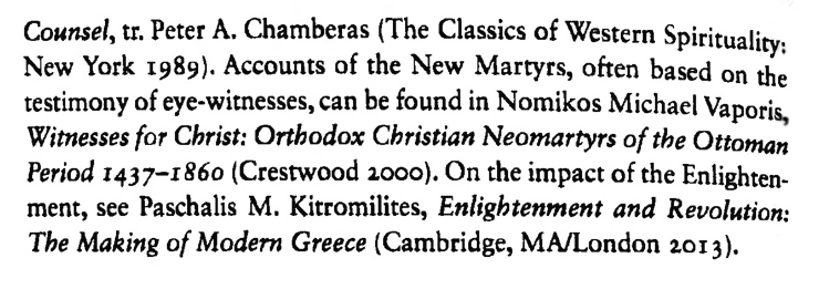 Counsel, tr. Peter A. Chamberas (The Classics of Western Spirituality-New York 1989). Accounts of the N ew M artyrs, often based on the testimony of eye-witnesses, can be found in N om ikos Michael Vaporis Witnesses for Christ: O rthodox Christian Neomartyrs o f the Ottoman Period 1437-1860 (Crestwood 2000). O n the im pact of the Enlightenment, see Paschalis M. Kitromilites, Enlightenment and Revolution: The Making o f M odem Greece (Cambridge, M A/London 2013).
