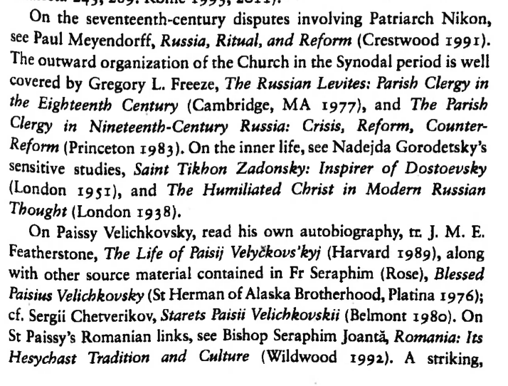 On Paissy Velichkovsky, read his own autobiography, tx J. M. E. Featherstone, The Life o f Paisij Velyckovs’kyj (Harvard 1989), along with other source material contained in Fr Seraphim (Rose), Blessed Paisius Velichkovsky (St Herman of Alaska Brotherhood, Platina 1976); cf. Sergii Chetverikov, Starets Paisii Velichkovskii (Belmont 1980). On St Paissy’s Romanian links, see Bishop Seraphim Joantä, Romania: Its Hesychast Tradition and Culture (Wildwood 1992). A striking,