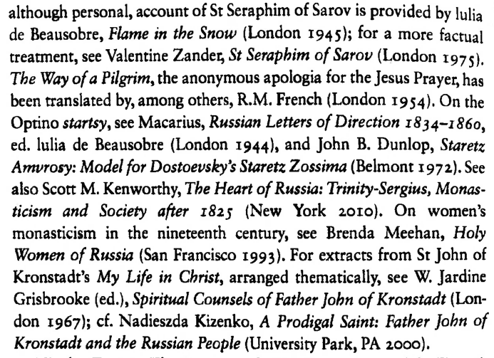 although personal, account of St Seraphim of Sarov is provided by lulia de Beausobre, Flame in the Snow (London 1945); for a more factual treatment, see Valentine Zander St Seraphim o f Sarov (London 1975), The Way of a Pilgrim, the anonymous apologia for the Jesus Prayer, has been translated by, among others, R.M. French (London 1954). On the Optino startsy, see Macarius, Russian Letters o f Direction 1834-1860, ed. lulia de Beausobre (London 1944), and John B. Dunlop, Staretz Amvrosy: Model for Dostoevsky’s Staretz Zossima (Belmont 1972). See also Scott M. Kenworthy, The Heart of Russia: Trinity-Sergius, Monasticism and Society after 1823 (New York 2010). On women’s monasticism in the nineteenth century, see Brenda Meehan, Holy Women of Russia (San Francisco 1993). For extracts from St John of Kronstadt’s My Life in Christ, arranged thematically, see W. Jardine Grisbrooke (ed.), Spiritual Counsels of Father John o f Kronstadt (London 1967); cf. Nadieszda Kizenko, A Prodigal Saint: Father John of Kronstadt and the Russian People (University Park, PA 2000).