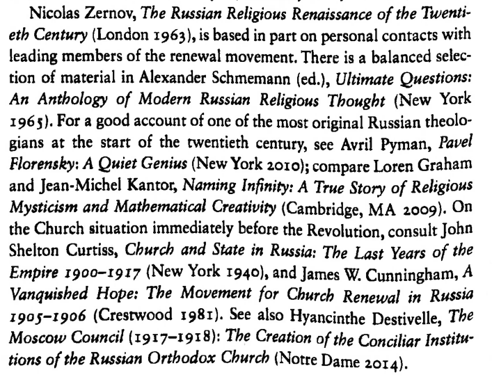 Nicolas Zernov, The Russian Religious Renaissance o f the Twentieth Century (London 1963), is based in part on personal contacts with leading members of the renewal movement. There is a balanced selection of material in Alexander Schmemann (ed.), Ultimate Questions: An Anthology o f Modern Russian Religious Thought (New York 1965). For a good account of one of the most original Russian theologians at the start of the twentieth century, see Avril Pyman, Pavel Florensky: A Quiet Genius (New York 2010); compare Loren Graham and Jean-Michel Kantor, Naming Infinity: A True Story o f Religious Mysticism and Mathematical Creativity (Cambridge, MA 2009). On the Church situation immediately before the Revolution, consult John Shelton Curtiss, Church and State in Russia: The Last Years o f the Empire 1900-1917 (New York 1940), and James W. Cunningham, A Vanquished Hope: The Movement for Church Renewal in Russia 1905-1906 (Crestwood 1981). See also Hyancinthe Destivelle, The Moscow Council (1917-1918): The Creation of the Conciliar Institutions o f the Russian Orthodox Church (Notre Dame 20x4).