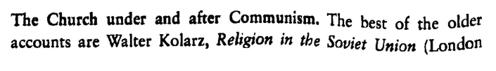 The Church under and after Communism. The best of the older accounts are Walter Kolarz, Religion in the Soviet Union (London