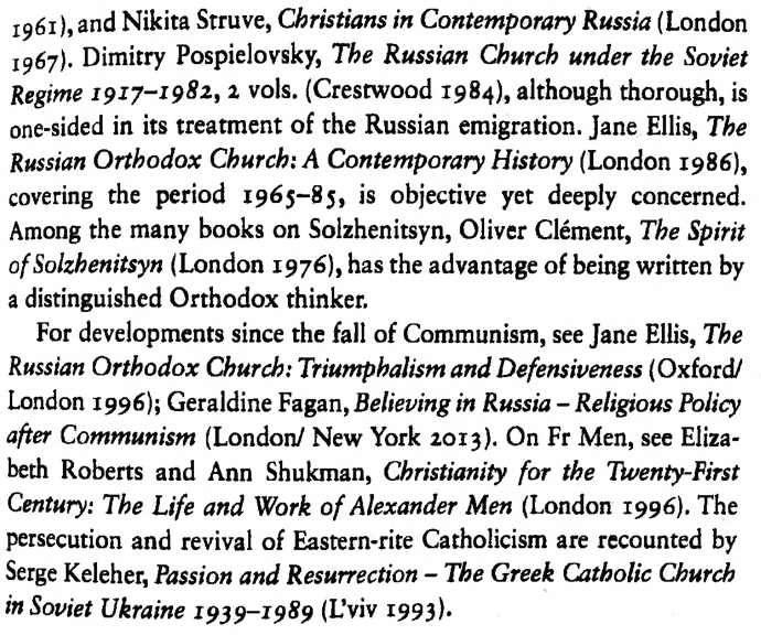 i 96i), and Nikita Struve, Christians in Contemporary Russia (London i 96j). Dimitry Pospielovsky, The Russian Church under the Soviet Regime 1917-1982, 2 vols. (Crestwood 1984), although thorough, is one-sided in its treatment of the Russian emigration. Jane Ellis, The Russian Orthodox Church: A Contemporary History (London 1986), covering the period 1965-85, is objective yet deeply concerned. Among the many books on Solzhenitsyn, Oliver Clément, The Spirit of Solzhenitsyn (London 1976), has the advantage of being written by a distinguished O rthodox thinker.
