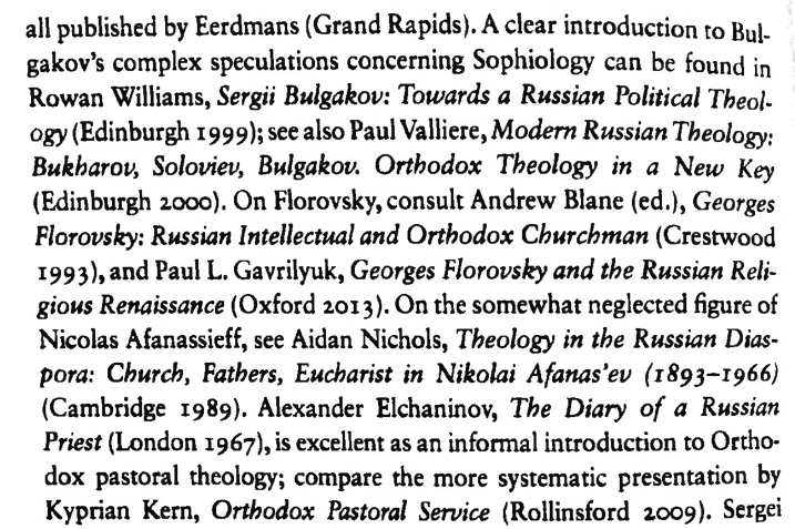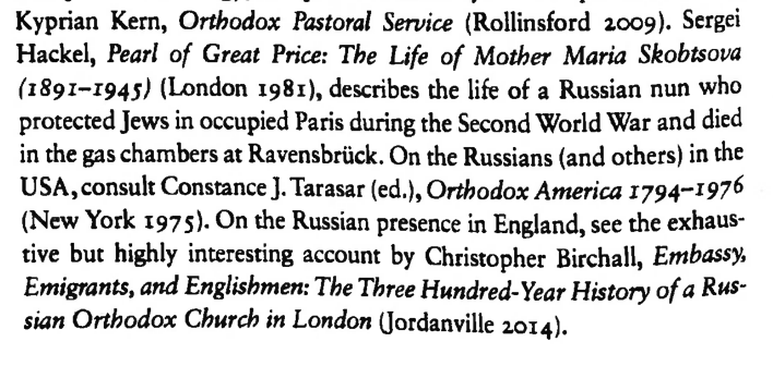 all published by Eerdmans (Grand Rapids). A clear introduction to Bulgakov’s complex speculations concerning Sophiology can be found in Rowan Williams, Sergii Bulgakov: Towards a Russian Political Theology (Edinburgh 1999); see also Paul Valliere, M odem RussianTheology: Bukharov, Soloviev, Bulgakov. Orthodox Theology in a New Key (Edinburgh 2000). On Florovsky, consult Andrew Blane (ed.), Georges Florovsky: Russian Intellectual and Orthodox Churchman (Crestwood 1993), and Paul L. Gavrilyuk, Georges Florovsky and the Russian Religious Renaissance (Oxford 2013). On the somewhat neglected figure of Nicolas Afanassieff, see Aidan Nichols, Theology in the Russian Diaspora: Church, Fathers, Eucharist in Nikolai Afanas’ev (1893-1966) (Cambridge 1989). Alexander Elchaninov, The Diary o f a Russian Priest (London 1967), is excellent as an informal introduction to Orthodox pastoral theology; compare the more systematic presentation by Kyprian Kern, Orthodox Pastoral Service (Rollinsford 2009). Sergei Hackel, Pearl of Great Price: The Life o f Mother Maria Skobtsova (1891-1945) (London 1981), describes the life of a Russian nun who protected Jews in occupied Paris during the Second World War and died in the gas chambers at Ravensbrück. On the Russians (and others) in the USA, consult Constance J.Tarasar (ed.), Orthodox America 1794-1976 (New York 1975)- On the Russian presence in England, see the exhaustive but highly interesting account by Christopher Birchall, Embassy, Emigrants, and Englishmen: The Three Hundred-Year History o f a Russian Orthodox Church in London (Jordanville 2014).
