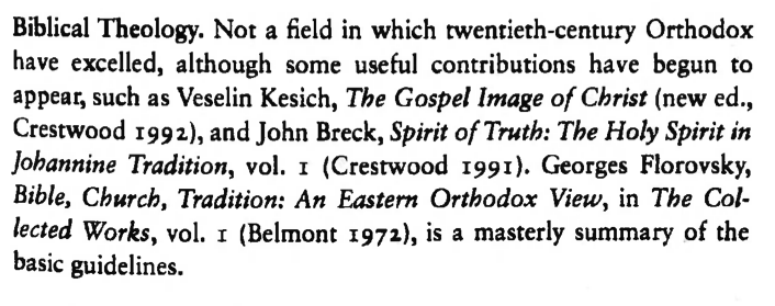Biblical Theology. N ot a field in which twentieth-century Orthodox have excelled, although some useful contributions have begun to appear, such as Veselin Kesich, The Gospel Image o f Christ (new ed., Crestwood 1991), and John Breck, Spirit o f Truth: The Holy Spirit in Johannine Tradition, vol. 1 (Crestwood 1991). Georges Florovsky, Bible, Church, Tradition: An Eastern Orthodox View, in The Collected Works, vol. i (Belmont 1972), is a masterly summary of the basic guidelines.