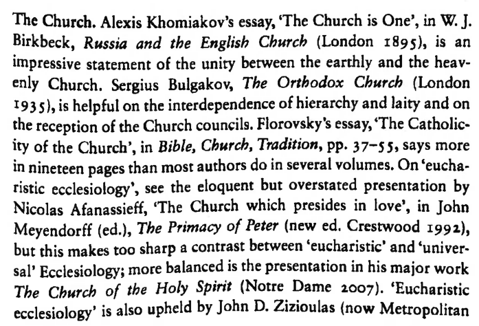 The Church. Alexis Khomiakov’s essay, ‘The Church is One’, in W. J. Birkbeck, Russia and the English Church (London 1895), is an impressive statement of the unity between the earthly and the heavenly Church. Sergius Bulgakov, The Orthodox Church (London 1935), is helpful on the interdependence of hierarchy and laity and on the reception of the Church councils. Florovsky’s essay,‘The Catholicity of the Church’, in Bible, Church, Tradition, pp. 37-53» says more in nineteen pages than most authors do in several volumes. On ’eucharistie ecclesiology’, see the eloquent but overstated presentation by Nicolas Afanassieff, ‘The Church which presides in love’, in John Meyendorff (ed.). The Primacy o f Peter (new ed. Crestwood 1992), but this makes too sharp a contrast between ’eucharistie’ and ‘universal’ Ecclesiology; more balanced is the presentation in his major work The Church o f the Holy Spirit (Notre Dame 2007). ‘Eucharistic ecclesiology’ is also upheld by John D. Zizioulas (now Metropolitan