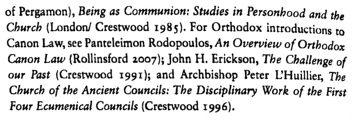 of Pergamon), Being as Communion: Studies in Personhood and the Church (London/ Crestwood 1985). For O rthodox introductions to Canon Law, see Panteleimon Rodopoulos, A n O verview o f Orthodox Canon Law (Rollinsford 2007); John H. Erickson, The Challenge of our Past (Crestwood 1991); and Archbishop Peter L’Huillier, The Church o f the Ancient Councils: The Disciplinary Work o f the First Four Ecumenical Councils (Crestwood 1996).