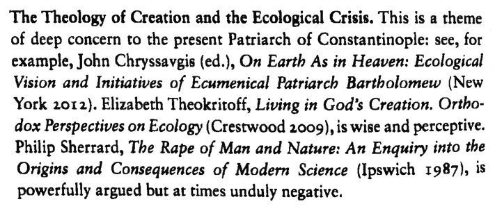 The Theology of Creation and the Ecological Crisis. This is a theme of deep concern to the present Patriarch of Constantinople: see, for example, John Chryssavgis (ed.), On Earth As in Heaven: Ecological Vision and Initiatives o f Ecumenical Patriarch Bartholomew (New York 2011). Elizabeth Theokritoff, Living in God’s Creation. Orthodox Perspectives on Ecology (Crestwood 2009), is wise and perceptive. Philip Sherrard, The Rape o f Man and Nature: An Enquiry into the Origins and Consequences o f M odem Science (Ipswich 1987), is powerfully argued but at times unduly negative.
