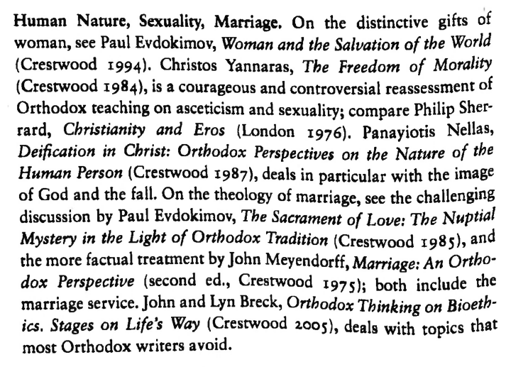 Human Nature, Sexuality, Marriage. On the distinctive gifts of woman, see Paul Evdokimov, Woman and the Salvation o f the World (Crestwood 1994)- Christos Yannaras, The Freedom o f Morality (Crestwood 1984), is a courageous and controversial reassessment of O rthodox teaching on asceticism and sexuality; compare Philip Sherrard, Christianity and Eros (London 1976). Panayiotis Nellas, Deification in Christ: Orthodox Perspectives on the Nature o f the Human Person (Crestwood 1987), deals in particular with the image of God and the fall. On the theology of marriage, see the challenging discussion by Paul Evdokimov, The Sacrament o f Love: The Nuptial Mystery in the Light o f Orthodox Tradition (Crestwood 1985), and the more factual treatment by John Meyendorff, Marriage: An Orthodox Perspective (second ed., Crestwood 1973); both include the marriage service. John and Lyn Breck, Orthodox Thinking on Bioethics. Stages on Life’s Way (Crestwood 2005), deals with topics that most O rthodox writers avoid.