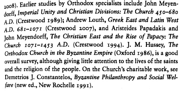 2**.008).** Earlier studies by O rthodox specialists include John Meyendorff, Imperial Unity and Christian Divisions: The Church 4 s 0-680 A.D. (Crestwood 1989); Andrew Louth, Greek East and Latin West A.D. 681-1071 (Crestw ood 2007), and Aristeides Papadakis and John Meyendorff, The Christian East and the Rise o f Papacy: The Church 1071-1453 A.D , (Crestwood 1994). J. M. Hussey, The Orthodox Church in the Byzantine Empire (O xford 1986), is a good overall survey, although giving little attention to the lives of the saints and the religion of the people. O n the Church’s charitable w ork, see Demetrios J. Constantelos, Byzantine Philanthropy and Social Welfare (new ed., New Rochelle 1991).