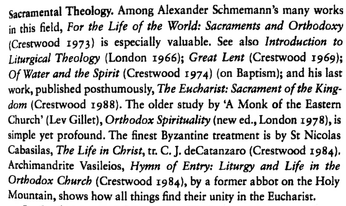 Sacramental Theology. Among Alexander Schmemann’s many works in this field, For the Life o f the World: Sacraments and O rthodoxy (Crestwood 1973) is especially valuable. See also Introduction to Liturgical Theology (London 1966); Great Lent (Crestwood 1969); O f Water and the Spirit (Crestwood 1974) (on Baptism); and his last work, published posthumously, The Eucharist: Sacrament o f the Kingdom (Crestwood 1988). The older study by ‘A M onk of the Eastern Church’ (Lev Gillet), O rthodox Spirituality (new ed., London 1978), is simple yet profound. The finest Byzantine treatment is by St Nicolas Cabasilas, The Life in Christ, tr. C. J. deCatanzaro (Crestwood 1984). Archimandrite Vasileios, H ym n o f Entry: Liturgy and Life in the Orthodox Church (Crestwood 1984), by a former abbot on the Holy Mountain, shows how all things find their unity in the Eucharist.