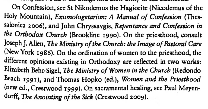On Confession, see St Nikodemos the Hagiorite (Nicodemus of the Holy Mountain), Exomologetarion: A Manual o f Confession (Thessalonica 2006), and John Chryssavgis, Repentance and Confession in the Orthodox Church (Brookline 1990). On the priesthood, consult Joseph J. Allen, The Ministry o f the Church: the Image o f Pastoral Care (New York 1986). On the ordination of women to the priesthood, the different opinions existing in Orthodoxy are reflected in two works: Elizabeth Behr-Sigel, The Ministry o f Women in the Church (Redondo Beach 1991), and Thomas Hopko (ed.), Women and the Priesthood (new ed., Crestwood 1999). On sacramental healing, see Paul Meyendorff, The Anointing o f the Sick (Crestwood 2009).