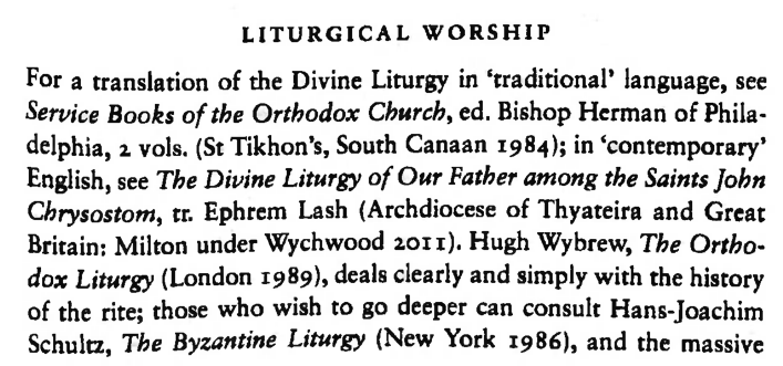 For a translation of the Divine Liturgy in ’traditional’ language, see Service Books o f the Orthodox Church, ed. Bishop Herman of Philadelphia, 2 vols. (St Tikhon’s, South Canaan 1984); in ‘contemporary’ English, see The Divine Liturgy o f Our Father among the Saints John Chrysostom, tr. Ephrem Lash (Archdiocese of Thyateira and Great Britain: Milton under Wychwood 2011). Hugh Wybrew, The Orthodox Liturgy (London 1989)» deals clearly and simply with the history of the rite; those who wish to go deeper can consult Hans-Joachim Schultz, The Byzantine Liturgy (New York 1986), and the massive