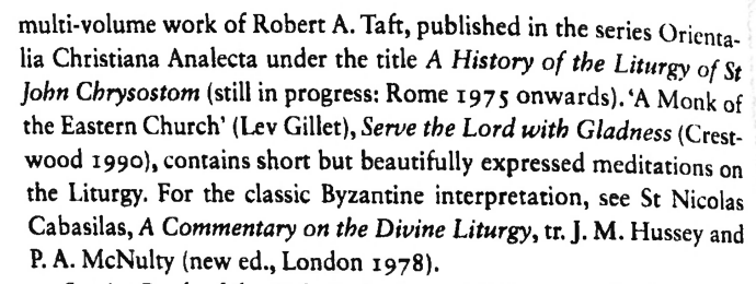 multi-volume work of Robert A. Taft, published in the series Oricntalia Christiana Analecta under the title A History o f the Liturgy of St John Chrysostom (still in progress: Rome 1975 onw ards).‘A Monk of the Eastern Church’ (Lev Gillet), Serve the Lord with Gladness (Crestwood 1990), contains short but beautifully expressed meditations on the Liturgy. For the classic Byzantine interpretation, see St Nicolas Cabasilas, A Commentary on the Divine Liturgy, tr. J. M. Hussey and P. A. McNulty (new ed., London 1978).