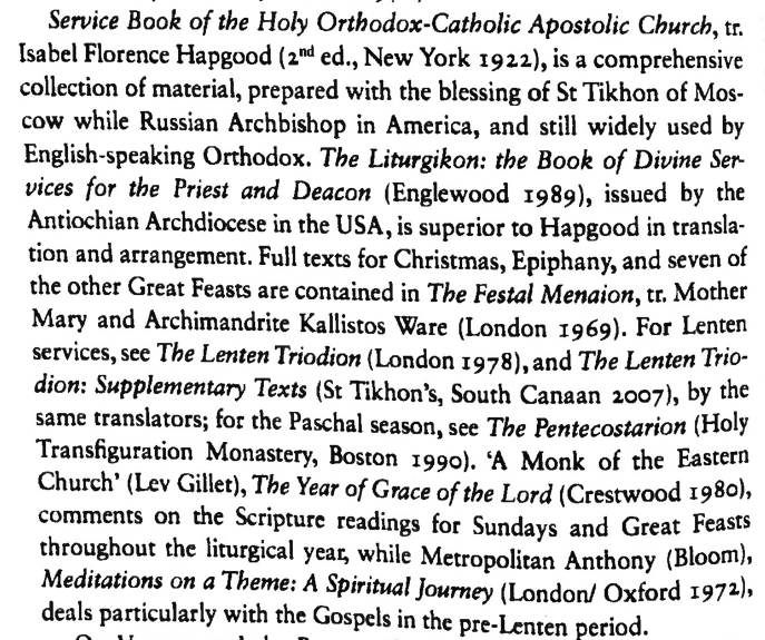 Service Book o f the Holy Orthodox-Catholic Apostolic Church, tr. Isabel Florence Hapgood (2nd ed., New York 1922), is a comprehensive collection of material, prepared with the blessing of St Tikhon of Moscow while Russian Archbishop in America, and still widely used by English-speaking Orthodox. The Liturgikon: the Book o f Divine Services for the Priest and Deacon (Englewood 1989), issued by the Antiochian Archdiocese in the USA, is superior to Hapgood in translation and arrangement. Full texts for Christmas, Epiphany, and seven of the other Great Feasts are contained in The Festal Menaion, tr. Mother Mary and Archimandrite Kallistos Ware (London 1969). For Lenten services, see The Lenten Triodion (London 1978), and The Lenten Triodion: Supplementary Texts (St Tikhon’s, South Canaan 2007), by the same translators; for the Paschal season, see The Pentecostarion (Holy Transfiguration Monastery, Boston 1990). ‘A Monk of the Eastern Church’ (Lev Gillet), The Year of Grace of the Lord (Crestwood i9 8o» comments on the Scripture readings for Sundays and Great Feasts throughout the liturgical year; while Metropolitan Anthony (Bloom), Meditations on a Theme: A Spiritual Journey (London/ Oxford 197*)’ deals particularly with the Gospels in the pre-Lenten period.