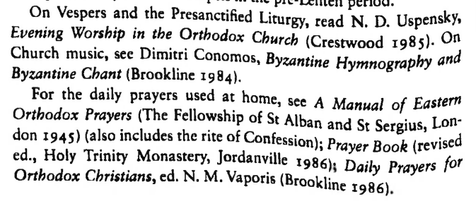 On Vespers and the Presanctified Liturgy, read N. D. Uspensky, Evening Worship in the Orthodox Church (Crestwood 1985). 0n Church music, see Dimitri Conomos, Byzantine Hymnography nnd Byzantine Chant (Brookline 1984).