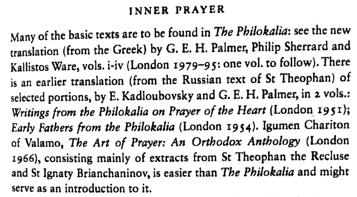 Many of the basic texts are to be found in The Philokalia: see the new translation (from the Greek) by G. E. H. Palmer^ Philip Sherrard and Kallistos Ware, vols, i-iv (London 1979- 95*• one vol. to follow). There is an earlier translation (from the Russian text of St Theophan) of selected portions, by E. Kadloubovsky and G. E. H. Palmer, in 2 vols.: Writings from the Philokalia on Prayer o f the Heart (London I 951)» Early Fathers from the Philokalia (London 1954). Igumen Chariton of Valamo, The Art o f Prayer: An O rthodox Anthology (London 1966), consisting mainly of extracts from St Theophan the Recluse and St Ignaty Brianchaninov, is easier than The Philokalia and might serve as an introduction to it.