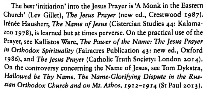 The best ‘initiation’ into the Jesus Prayer is ‘A M onk in the Eastern Church’ (Lev Gillet), The Jesus Prayer (new ed., Crestwood 1987). Irénée Hausherr, The Name o f Jesus (Cistercian Studies 44: Kalamazoo 1978), is learned but at times perverse. On the practical use of the Prayer, see Kallistos Ware, The Power o f the Name: The Jesus Prayer in Orthodox Spirituality (Fairacres Publication 43: new ed., Oxford 1986), and The Jesus Prayer (Catholic Truth Society: London 2014). On the controversy concerning the Name of Jesus, see Tom Dykstra, Hallowed be Thy Name. The Name-Glorifying Dispute in the Russian Orthodox Church and on Mt. Athos, 1912-1914 (St Paul 20x3).