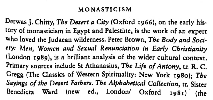 Derwas J. Chitty, The Desert a City (Oxford 1966), on the early history of monasticism in Egypt and Palestine, is the work of an expert who loved the Judaean wilderness. Peter Brown, The Body and Society: Men, Women and Sexual Renunciation in Early Christianity (London 1989), is a brilliant analysis of the wider cultural context. Primary sources include St Athanasius, The Life o f Antony, tr. R. C. Gregg (The Classics of Western Spirituality: New York 1980); The Sayings o f the Desert Fathers. The Alphabetical Collection, tr. Sister Benedicta Ward (new ed., London/ Oxford 1981) (the