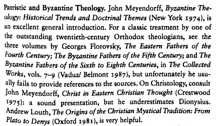 Patristic and Byzantine Theology. John Meyendorff, Byzantine Theology: Historical Trends and Doctrinal Themes (New York 1974), is an excellent general introduction. For a classic treatment by one of the outstanding twentieth-century Orthodox theologians, see the three volumes by Georges Florovsky, The Eastern Fathers o f the Fourth Century; The Byzantine Fathers o f the Fifth Century; and The Byzantine Fathers o f the Sixth to Eighth Centuries, in The Collected Works, vols. 7 -9 (Vaduz/ Belmont 1987), but unfortunately he usually fails to provide references to the sources. On Christology, consult John Meyendorff, Christ in Eastern Christian Thought (Crestwood I975): a sound presentation, but he underestimates Dionysius. Andrew Louth, The Origins o f the Christian Mystical Tradition: From Plato to Denys (Oxford 1981), is very helpful.