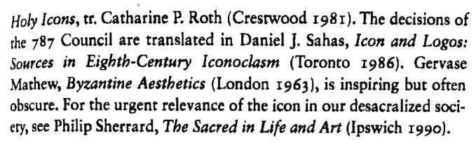 Holy Icons, tr. Catharine P. Roth (Crestwood 1981). The decisions of the 787 Council are translated in Daniel J. Sahas, Icon and Logos: Sources in E ighth-C entury Iconoclasm (Toronto 1986). Gervase Mathew, B yzantine A esthetics (London 1963), is inspiring but often obscure. For the urgent relevance of the icon in our desacralized society, see Philip Sherrard, T he Sacred in L ife and A rt (Ipswich 1990).