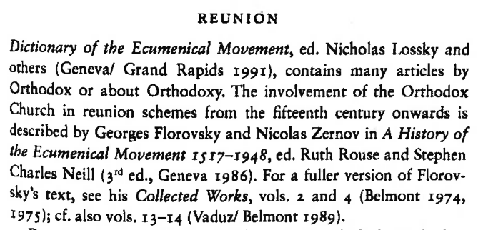 Dictionary o f the Ecum enical M ovem ent, ed. Nicholas Lossky and others (Geneva/ Grand Rapids 1991), contains many articles by Orthodox or about Orthodoxy. The involvement of the Orthodox Church in reunion schemes from the fifteenth century onwards is described by Georges Florovsky and Nicolas Zernov in A H istory o f the Ecumenical M ovem ent 1517-1948, ed. Ruth Rouse and Stephen Charles Neill (3rd ed., Geneva 1986). For a fuller version of Florovsky’s text, see his Collected Works, vols. 2 and 4 (Belmont 1974, 1975); cf. also vols, 13-14 (Vaduz/ Belmont 1989).