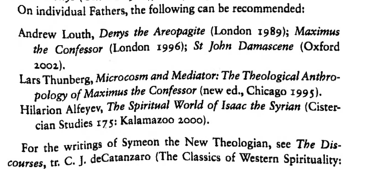- Andrew Louth, Denys the Areopagite (London 1989); Maximus the Confessor (London 1996); St John Damascene (Oxford 2.002.).