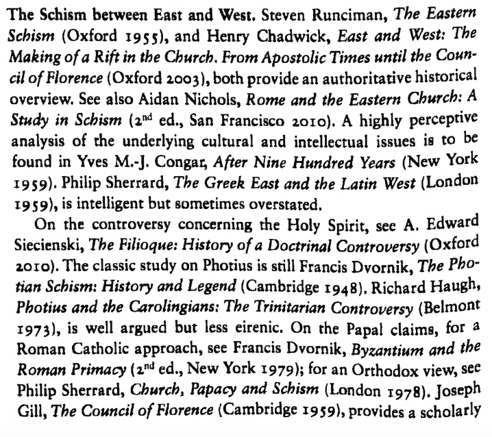 On the controversy concerning the Holy Spirit, see A. Edward Siecienski, The Filioque: History o f a Doctrinal Controversy (Oxford 2010). The classic study on Photius is still Francis Dvornik, The Photian Schism: History and Legend (Cambridge 1948). Richard Haughi Photius and the Carolingians; The Trinitarian Controversy (Belmont I973)i is well argued but less eirenic. On the Papal claims, for a Roman Catholic approach, see Francis Dvornik, Byzantium and the Roman Primacy (2nd ed., New York 1979); for an Orthodox view, see Philip Sherrard, Church, Papacy and Schism (London 1978). Joseph Gill, The Council o f Florence (Cambridge 1959), provides a scholarly