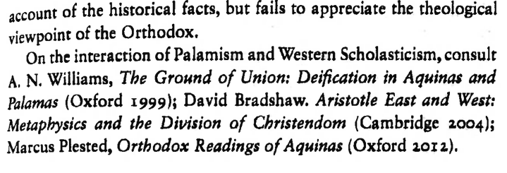 On the interaction of Palamism and Western Scholasticism, consult A. N. Williams, The G round o f Union: Deification in Aquinas and Palamas (Oxford 1999); David Bradshaw. Aristotle East and West: Metaphysics and the Division o f Christendom (Cambridge 2004); Marcus Plested, O rthodox Readings o f Aquinas (O xford 2012).