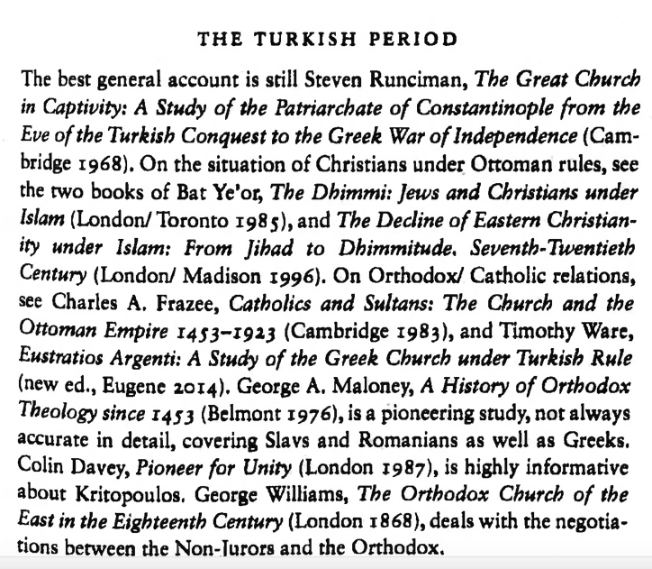 The best general account is still Steven Runciman, The Great Church in Captivity: A Study o f the Patriarchate o f Constantinople from the Eve o f the Turkish Conquest to the Greek War o f Independence (Cambridge 1968). On the situation of Christians under O ttom an rules, see the two books of Bat Ye’or, The Dhimmi: Jews and Christians under Islam (London/Toronto 1985), and The Decline o f Eastern Christianity under Islam: From Jihad to Dhimmitude. Seventh-Twentieth Century (London/ M adison 1996). On Orthodox/ Catholic relations, see Charles A. Frazee, Catholics and Sultans: The Church and the Ottoman Empire 1453-1923 (Cambridge 1983), and Timothy Ware, Eustratios Argenti: A Study o f the Greek Church under Turkish Rule (new ed., Eugene 2014). George A. Maloney, A History o f Orthodox Theology since 1453 (Belmont 1976), is a pioneering study, not always accurate in detail, covering Slavs and Romanians as well as Greeks. Colin Davey, Pioneer for Unity (London 1987), is highly informative about Kritopoulos, George Williams, The Orthodox Church o f the East in the Eighteenth Century (London 1868), deals with the negotiations between the Non-Jurors and the Orthodox.